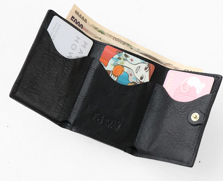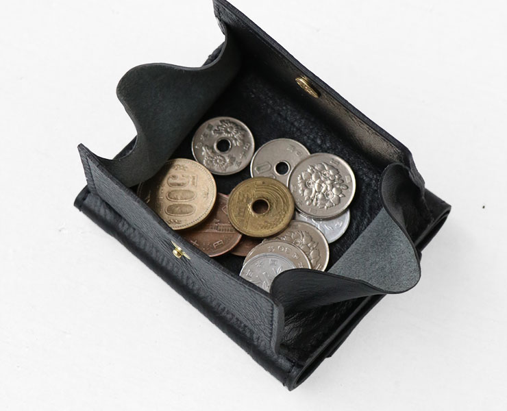 内部には札入れとカード入れをバランスよく配し、外装には小銭入れを備えています。
