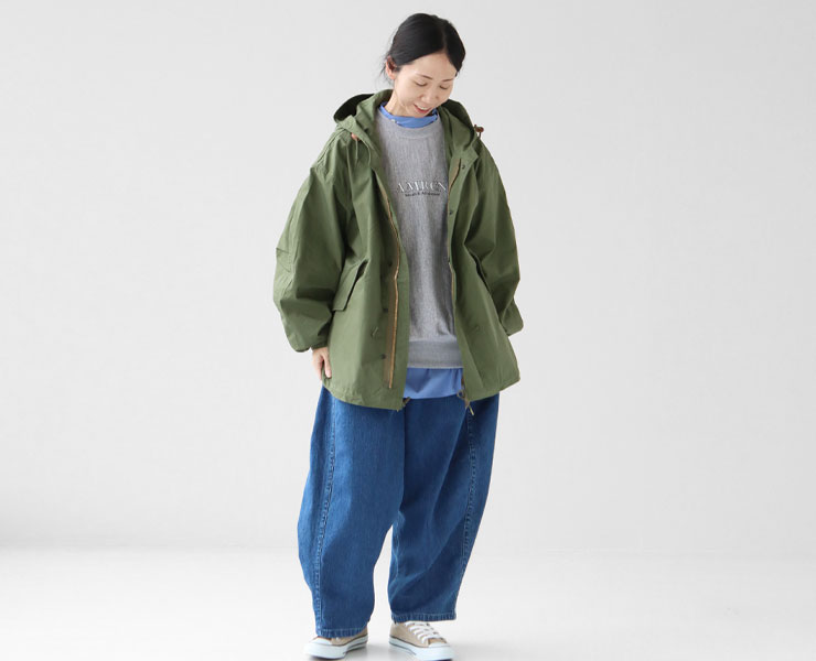 コットンナイロンの生地を使用し、軽量で、季節の変わり目にライトアウターと活躍するのももちろん、ゆったりとした身頃と袖ラインなので季節に応じてインに着るアイテムをスライドできるのも高ポイントです。