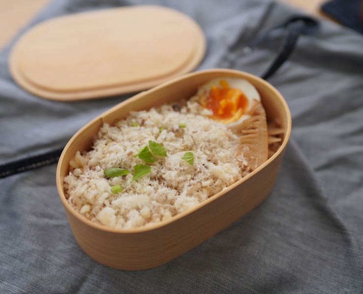 朝食は曲げわっぱに詰まれた炊き込みご飯を食べました。
