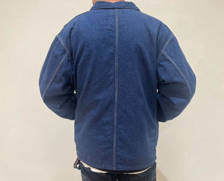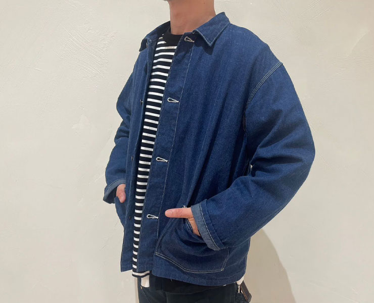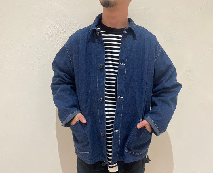 EMON(エモン)のデニム カバーオール。40’sのUSカバーオールをデザインソースにしたジャケット。