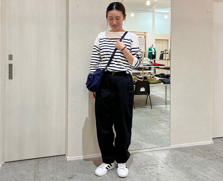 このパンツは女性が着てもサイズ感はゆとりがあり着心地は楽なのに、シルエットは意外とスッキリして見えるので