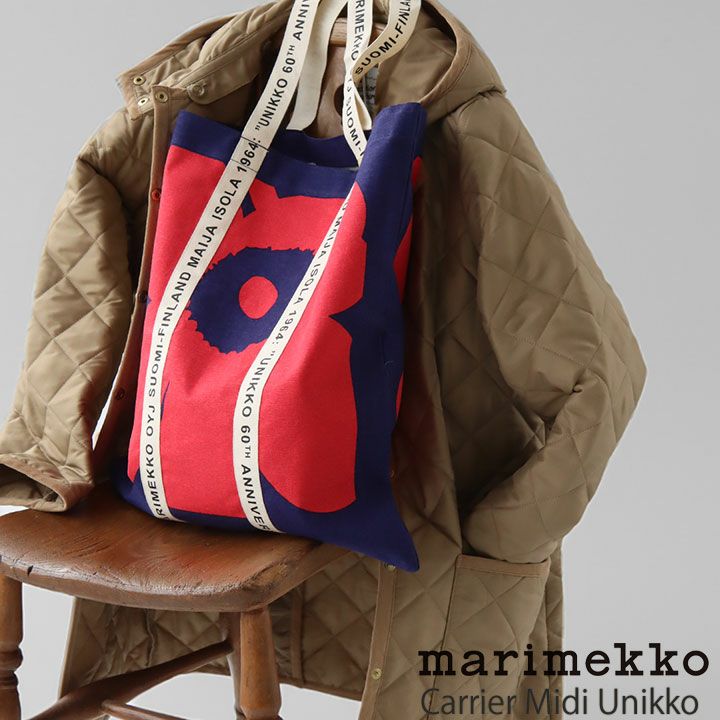 marimekko(マリメッコ)のkioskiシリーズのトートバッグ。大胆なウニッコ柄に、コントラストの綺麗なブルーとレッドの配色のケシの花をモチーフにしたファブリックバッグ。本体はコットンと麻のブレンド素材を採用しており、ナチュラルな生地の表情もポイント。持ち手部分には60周年アニバーサリーのテキストを配してアクセントに。フラットタイプは畳んで持ち運びしやすく、サブバッグとしてもお使いいただけます。