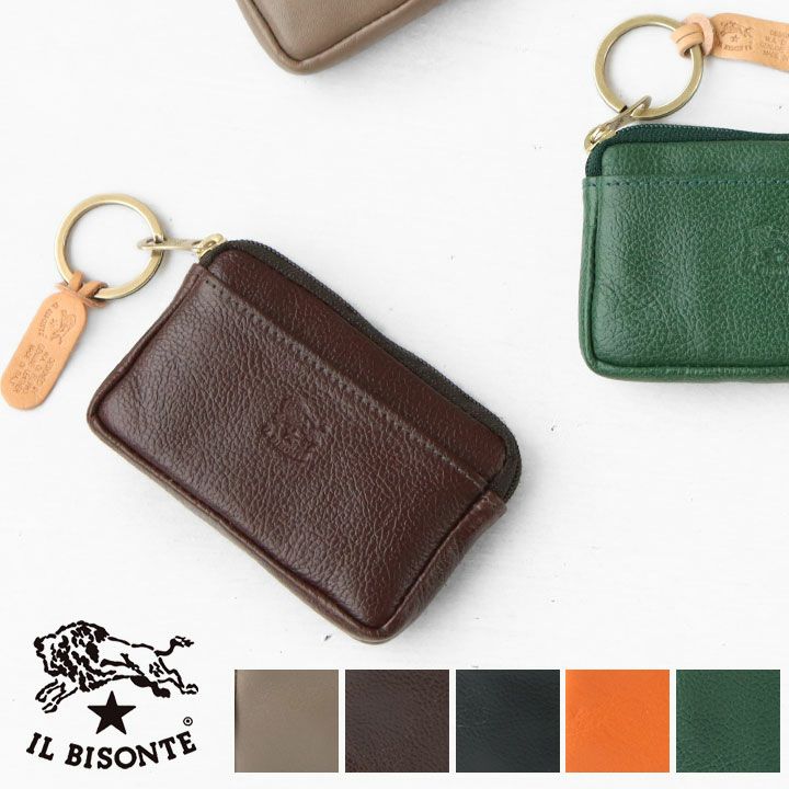 IL BISONTE(イルビゾンテ)のコインパース。スクエアフォルムのシンプルなデザインで、間口はジップクロージャー。外側にカードを収納できるポケットを配置。ジップの引き手はキーリングとしても使えるスマートなデザインに仕上げられています。
