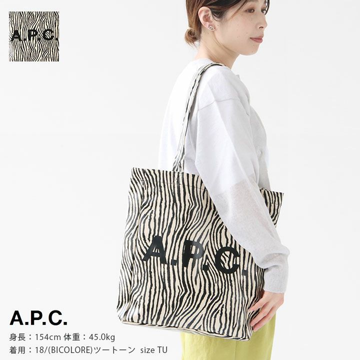 A.P.C.(アーペーセー)のLouトートバッグ。ユニセックスで使えるリサイクルレザー風ゼブラ柄プリントトート。布地にポリウレタン樹脂を塗布した合皮素材を使用。伸縮性があるのでシワになりにくく、ある程度の撥水性があるため、水に濡れても乾きやすく、汚れてもさっと拭き取ることができます。肩掛けもできる長めの持ち手に、A4サイズの書類もすっぽり入る使い勝手の良い長方形のフォルムもポイント。メインバッグとしてはもちろん、通勤や通学用のサブバッグ、マザーズバッグ、お買い物のエコバッグなどなど、幅広いシーンに多用途に使えます。洗練されたツートンカラーと存在感のあるロゴデザインが、シンプルなコーディネートに取り入れるだけでメリハリのあるおしゃれな着こなしに導いてくれます。着用モデル:身長154cm/体重45kg