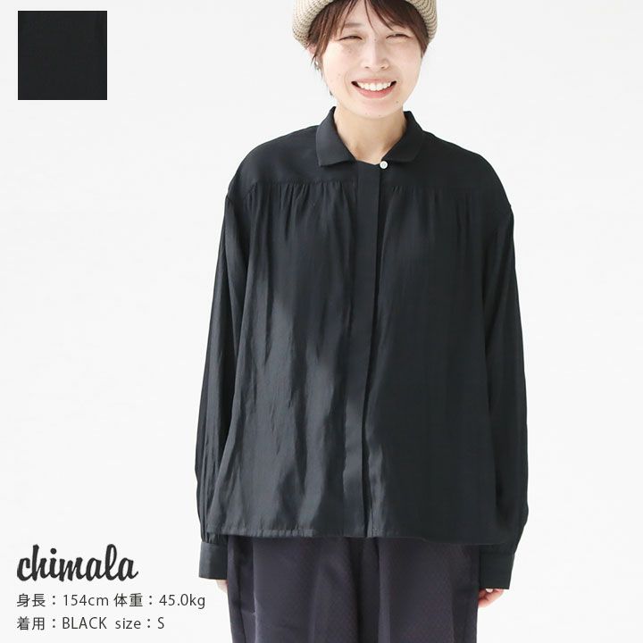 chimala(チマラ)のギャザーシャツ。ポリエステル素材の細かな織り柄が上品なドビー生地を使用。トロンとした落ち感と、生地の凹凸感による陰影により、無地でありながらも奥行きのある着こなしが叶います。小さめの襟やボタンをあしらった首周りのデザインに加え、前立てはミニマルな比翼仕立てでクラシカルな印象。透け感があることで、可愛らしさと大人っぽさを両立してくれます。一枚着としてはもちろん、カーディガンやジャケットのインナーとしても存在感を発揮してくれる、シーズンレスに活躍するアイテムです。着用モデル:身長154cm/体重45kg
