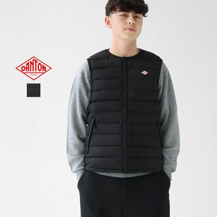 DANTONのクルーネックインナーダウンベストは、リサイクルダウンを採用した環境配慮型モデル。マットな質感のナイロンタフタが上品で、程よいハリと軽量性を両立。シャツやスウェットに重ねてももたつかず、秋冬のレイヤードに最適です。