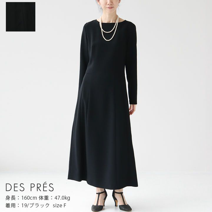 DES PRES(デ・プレ)のライトダブルクロス フレアワンピース。上品なネックラインと着丈でクラシカルかつエレガントな印象の一着。ウエスト高めの位置にタックを施しふんわりとした丸みを出しつつも、きゅっとウエストラインを引き締めることでメリハリのあるバランスに仕上げられています。さらりと着用するだけでスタイリングが決まり、デイリーからオケージョンシーンまで幅広く活躍してくれるアイテムです。素材にはシルクのように膨らみのあるタッチで、ほど良いハリ感と光沢がある上品な風合いが魅力の平二重のナチュラルストレッチ素材を使用したライトダブルクロスを採用。シワになりにくく、軽い着心地もポイントです。着用モデル:身長160cm/体重47kg
