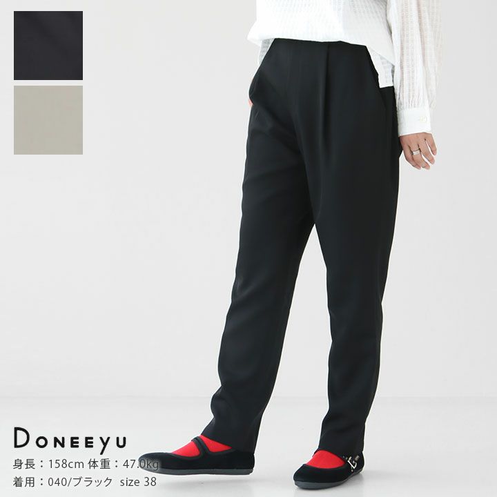 DONEEYU(ドニーユ)のトリアセテート テーパードパンツ。トリアセテート混素材を使った、光沢感のある生地感。さらりとした肌触りで、軽い穿き心地のアイテムです。タックの入ったデザインは動きやすく、すっきりとしたシルエットに。ウエスト後ろはゴム仕様でストレスフリーに着用していただけます。オフィスシーンではもちろん、大人のデイリースタイルにもオススメです。着用モデル:身長158cm/体重47kg