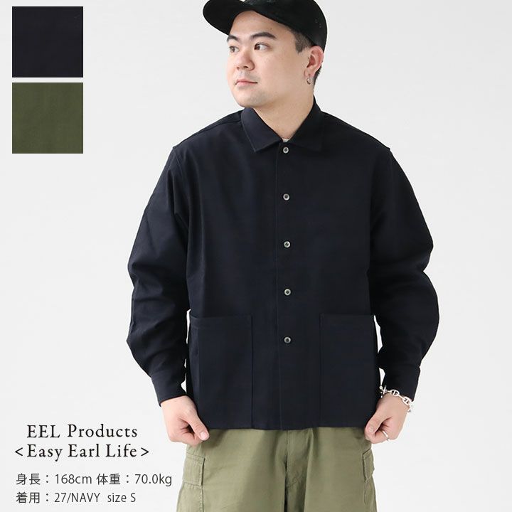 EEL Products(イール プロダクツ)のショートショット。素材には微起毛した度詰めツイル生地を使用したシャツジャケット。程よいハリ感がありつつも柔らかくタフな風合いが魅力の生地感です。ゆとりを持たせた身幅に、ショート丈がバランスの良いシルエット。両サイドに裾を絞れボタン付きで、シルエットを変えて楽しんでいただけます。収容力の高い大きな2つのポケットがポイント。羽織としてはもちろん、シャツ感覚でトップスとしても着まわしていただけます。アウターとしてもインナーとしても着まわせて、秋口から春先までロングシーズン活躍するアイテムです。着用モデル:身長168cm/体重70kg(Sサイズ着用)