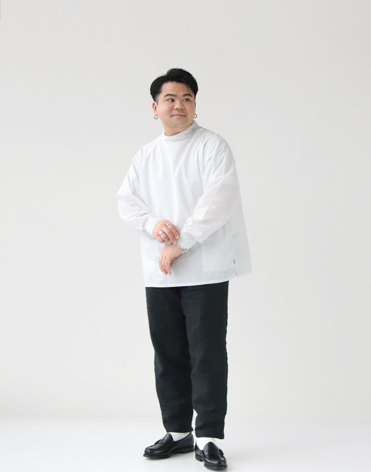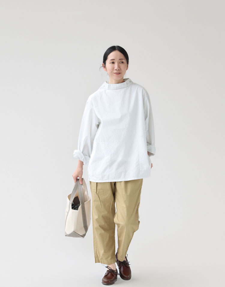 EMON(エモン)のスモックシャツ。メイド イン ジャパンならではの生地のこだわり、細やかなディテールがこなれ感ある着こなしを演出する一枚です。モックネック風の首元が印象的で、身体のラインを拾わないリラックスしたシルエット、ふんわりエアリー感のある質感が魅力です。素材は、薄くて軽く、通気性、速乾性のあるコットンボイを採用し、シアサッカーの様な生地表面の「うねり」も表情をプラス。暑いシーズンも快適に着用いただけます。