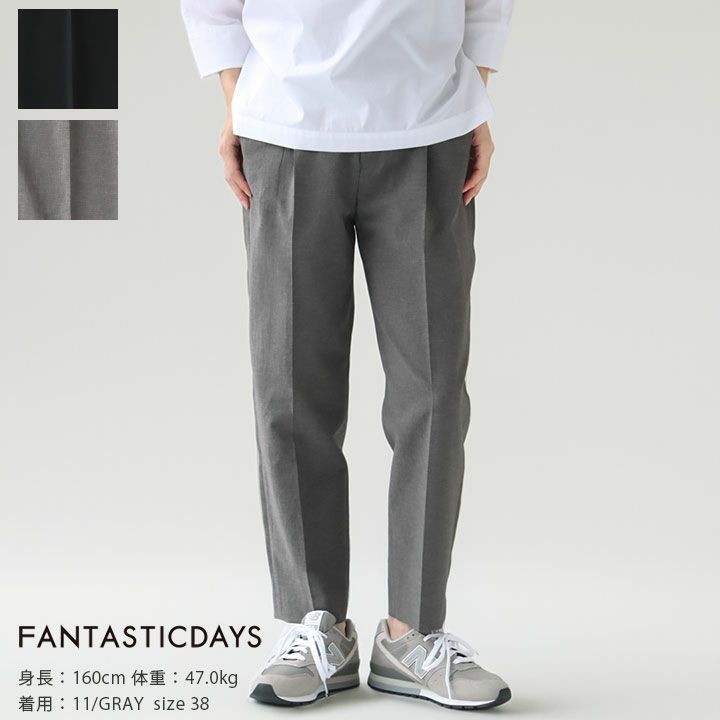 FANTASTICDAYS(ファンタスティックデイズ)のタックテーパードパンツ。アンクル丈ほどで穿いて頂ける美脚ラインを存分に堪能いただけるテーパードパンツです。素材はポリエステル。速乾性があり、とても軽くて、真夏でも涼しく快適な穿き心地が病みつきになります。ちょっと綺麗目パンツを合わせたいお出かけコーデにも、オフィススタイルにも使える万能なフェイスもポイントです。バックウエスト部分はゴム仕様。着用モデル:身長160cm/体重47kg
