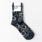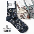 FRENCH BULL(フレンチブル)のミュリールソックス。フルーツや木の実の収穫をイメージ。ベースはガス焼処理により毛羽を抑えたシルケットの綿糸で程よい厚みに編み立てられています。切り絵のような幾何学柄がポイントで、コーディネートのアクセントになる1足です。