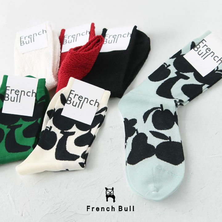FRENCH BULL(フレンチブル)のフリュイソックスは、いろいろなフルーツ柄を全体に散りばめたデザインが可愛い一足。微かな光沢感のあるさらりとした綿糸で薄く編みたて、品の良いアクセントを加えます。