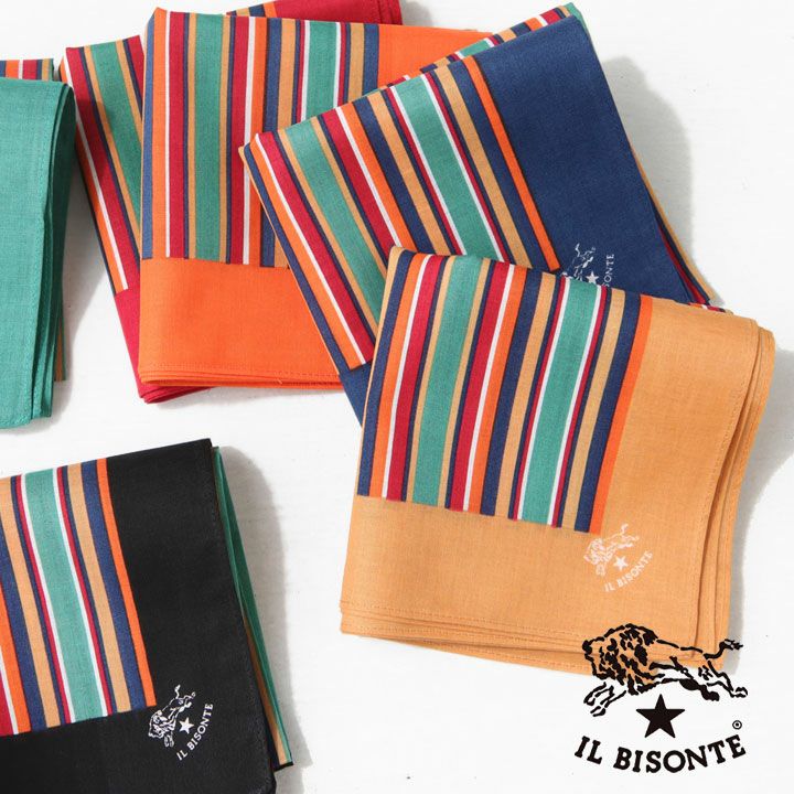 IL BISONTE(イルビゾンテ)定番のマルチストライプ柄のバンダナ。ファッションのアクセントや、お弁当包みとしても、ハンカチとしても多様に使える大判サイズです。季節に関係なくポップな気分にしてくれそうなアイテムはギフトとしても喜ばれるアイテムです。