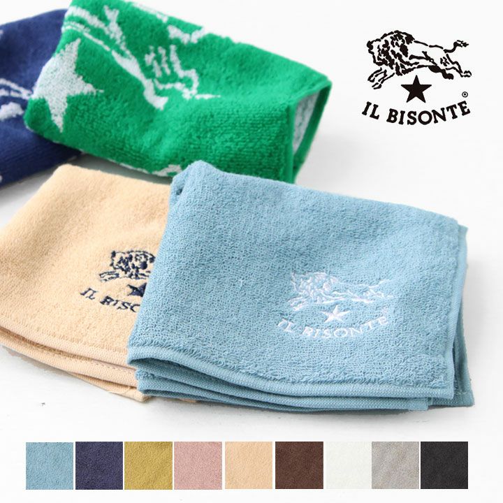IL BISONTE(イルビゾンテ)のミニタオル。四国今治で染め織りした、今治タオルを使用したミニタオル。柔らかな触り心地で、吸水性も抜群。25×25cmサイズのデイリー使いに最適なサイズで、コンパクトに畳めるのでポケットの中でも嵩張りません。バッファローロゴ入りのデザインです。