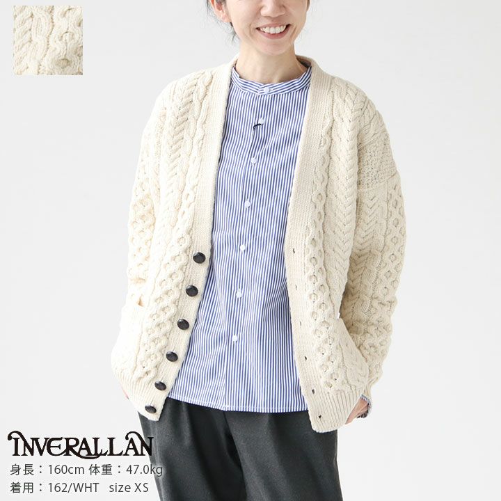 Inverallan(インバーアラン)のシンプルなアラン柄カーディガン。2017秋冬よりスタートしたブランドの機械編みで、よりカジュアルなニューライン“Inverallan Sportswear Authentic“ 。あたたかみのあるウール100%を使用し、インバーアラン特有の丁寧な編みこみがナチュラルで上品な印象に仕上がっています。着用モデル:身長160cm/体重47kg