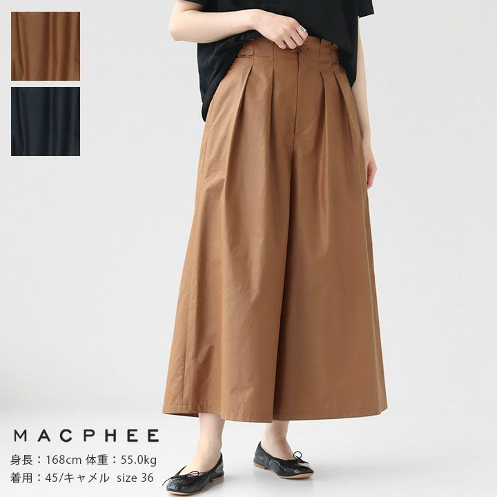 MACPHEE(マカフィー)のクリスピータフタ タックワイドパンツ。コットンとポリエステルをミックスして織り上げたタフタ素材を使用。加工を施して表面に光沢感を出すことでナチュラルな風合いにクリスピーなタッチをプラスした生地感です。スカートのようなフレアラインをウエストのタックディテールや、やや短めの丈感ですっきりと仕上げられたパンツです。ウエストは両サイドのベルトでサイズ調整が可能。お好みのフィット感で着用していただけます。パンツにすることで、大人カジュアルな雰囲気を演出します。着用モデル:身長168cm/体重55kg