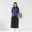 アッシュブルーの半袖ポロニットを主役にした、大人のリラックスカジュアルコーデ。上品なくすみカラーが涼しげで、春夏の着こなしに最適です。ギャザーがたっぷり入ったブラックのロングスカートが、動きと軽やかさをプラス。ほどよいボリューム感で、体型カバーにも◎足元は白スニーカーで清潔感を出し、ライトグレーのトートバッグで全体を引き締めています。大人きれいなナチュラルな着こなしです。