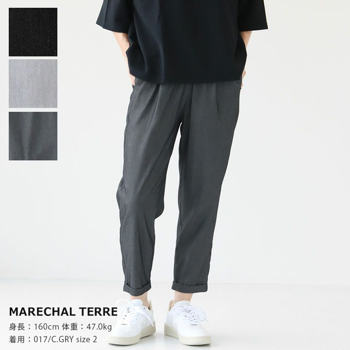 MARECHAL TERRE(マルシャル テル)の定番ギャザーイージーパンツ。ウエストは安定感のある平ゴムをぐるり、両サイドにポケット付き。楽ちんさはキープしつつ、きちんと感ありの印象でデイリーユースに重宝する1本です。足首を美しく見せるクロップド丈に、ロールアップデザインと着こなしをすっきりと見せてくれるデザインもポイント。上品な光沢感と程よく落ち度のある質感、そしてテーパードラインならではのバランスは1度掃くとシルエットの虜に。オンオフともに肩ひじ張らない上品な華やぎを演出してくれます。着用モデル:身長160cm/体重47kg