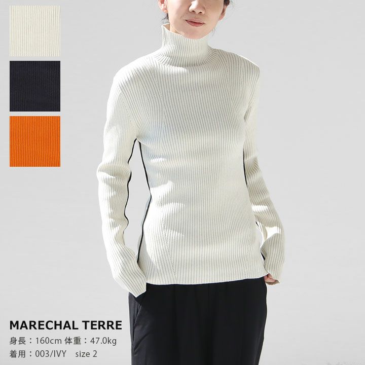 MARECHAL TERRE(マルシャル テル)のタートルリブニット。モチモチした肌触りで着心地が良く、厚みのある素材で体のラインをひろいにくく、キックバックのある特性をいかしたフィット感のあるシルエットが魅力の一枚。前身頃は、衿から裾にかけ、バスト・ウエストといった体のラインが綺麗に見える、カービーな変形リブ柄を入れ、女性らしいシルエットを演出。袖下と両サイドには配色のパイピングでアクセントをつけてデザインのポイントとなっています。1枚からレイヤードスタイルまでコーディネートの幅を広げてくれます。着用モデル:身長160cm/体重47kg