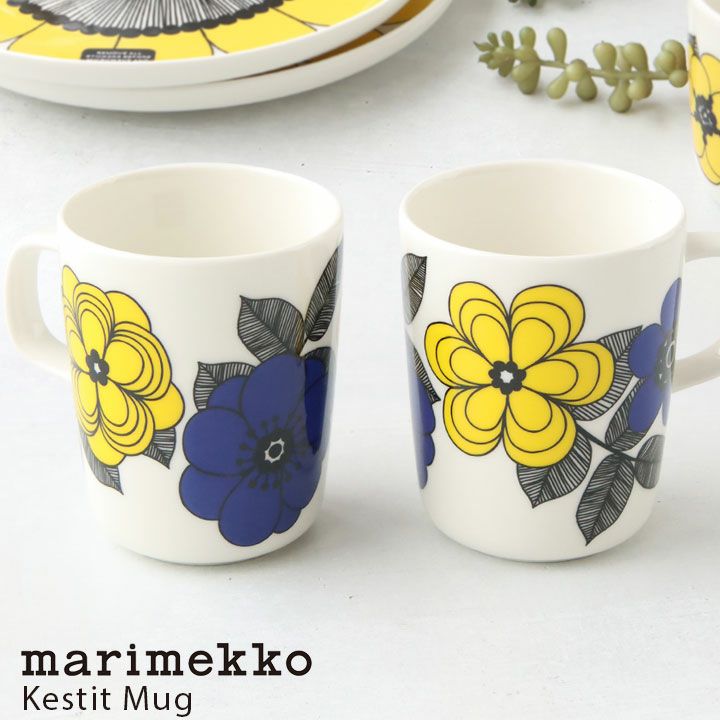 marimekko(マリメッコ)のケスティット マグカップ。フィンランド語で"楽しませる"という意味を持つkestit柄のマグカップ。レモンイエローとロイヤルブルーの24春夏の限定カラーで登場です。甘すぎない色合いとヴィンテージライクなお花柄で、飽きのこない印象的なテキスタイルデザインに仕上がっています。容量はデイリーに使い勝手の良い250mlで、同柄のプレートやボウルとの組み合わせもおすすめ。お食事やティータイムに華やかな彩りを添えてくれるアイテムです。