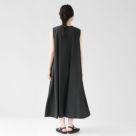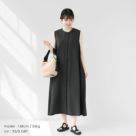 ノースリーブワンピースを主役に、ブラックのサンダルで足元に抜け感をプラス。ナチュラルな素材感のかごバッグを合わせることで、夏らしい軽やかさを演出。落ち感のあるシルエットが美しく、横から見てもふんわりと広がるシルエットが女性らしさを引き立ててくれます◎