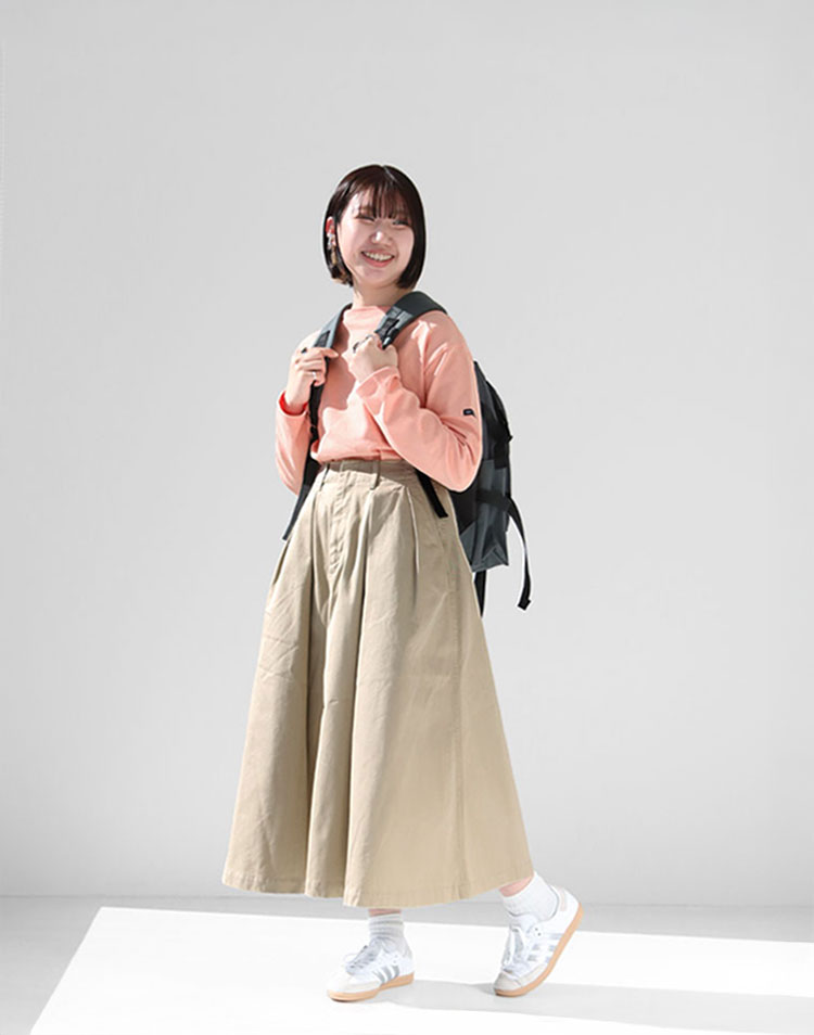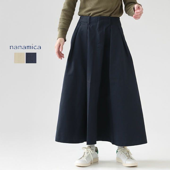 タック入りのロング丈スカートというオーセンティックなデザインが、クラシックな雰囲気を演出。チノ素材を使用しながらも、軽さと快適さを持たせたハイブリッド素材で、デザイン性と機能性を両立しています。