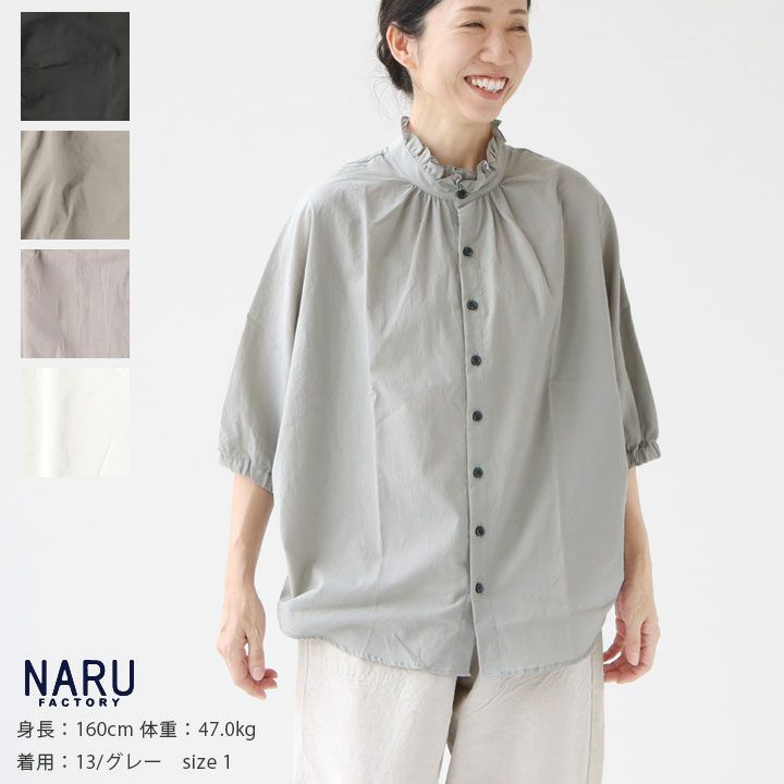 NARU(ナル)のフリル襟ドルマンシャツ。程よいフリルとドルマンスリーブのシャツなので可愛すぎず、大人の女性を演出してくれます。素材には軽くふわっとした風合いのコットン素材を使用。ハンドワッシャー加工が施されており、独特のシワ感が特徴です。バックにもギャザーが施されており、前後2WAYで着用頂けます。着用モデル:身長160cm/体重47kg