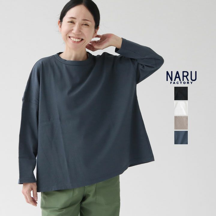 NARU(ナル)の40/2天竺 ワイドTシャツ。ゆったりとした着心地が魅力のカットソーです。ドロップショルダーと裾に広がるラインシルエットが、女性らしい表情をさりげなくコーディネートにプラスしてくれます。肌に優しく馴染み、快適な着心地もポイント。日常のコーディネートにぴったりの一枚です。着用モデル:身長160cm/体重47kg
