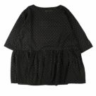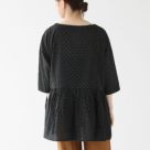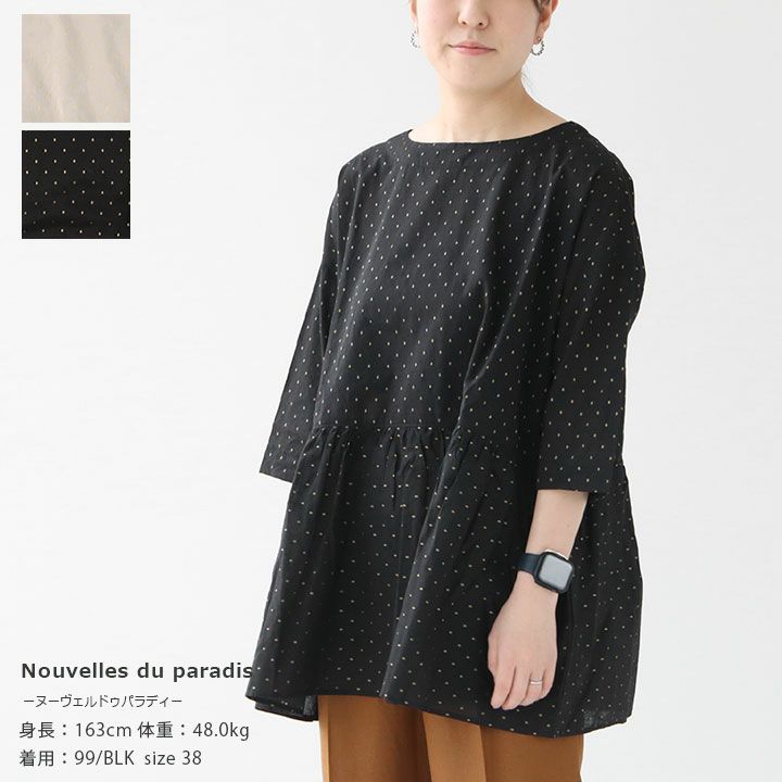 Nouvelles du paradis(ヌーヴェルドゥパラディ)のコットン ギャザーブラウス。ほんのり透け感のある綿素材を使用。金糸の刺繍が大人上品なデザインです。これからの季節に着やすいサラッと薄手の生地が季節感を演出。裾に向かってふんわり広がるAラインシルエット、たっぷりのギャザーが大人可愛い印象に仕上がった一着。カジュアルからキレイめまで、春夏の着こなしを昇華してくれるアイテムです。着用モデル:身長163cm/体重48kg