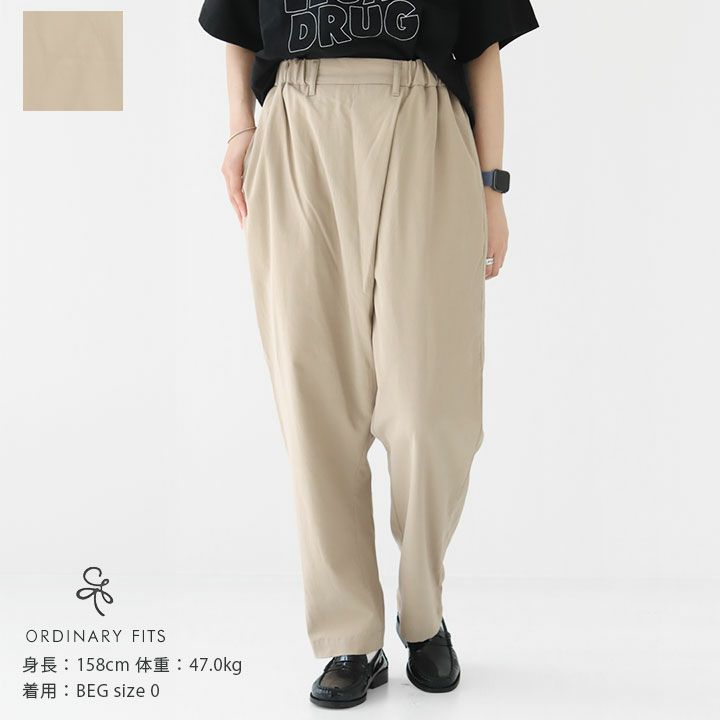Ordinary fits(オーディナリーフィッツ)のツイストパンツ。ふんわりと優しい肌あたりのピーチスキン生地を使用。起毛加工を施すことで生まれる、柔らかな風合いが魅力です。フロントにタックを施して、重ね合わせたようなデザインがタイパンツのような雰囲気に仕上がったサルエルパンツに近い穿き心地のパンツです。太ももからヒップにかけてはゆったりとしていて、足ラインを綺麗に見せてくれるテーパードシルエット。バッグウエストはゴム仕様になっており、リラックス感のある穿き心地ながらも、綺麗なシルエットでバランスよく仕上げてくれます。いつものトップスに合わせるだけで、こなれ感のある装いに仕上げてくれる一着です。着用モデル:身長158cm/体重47kg