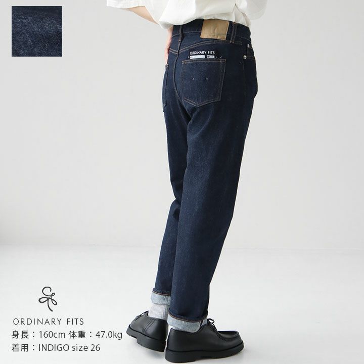 Ordinary fits(オーディナリーフィッツ)のデニムパンツ。腰まわりは少しゆったり、でもテーパードシルエットと深みのあるインディゴカラーで適度にすっきりとして見え、ゆる感が大人カジュアルにぴったりハマる5ポケットアンクルデニム。少しロールアップすることでコーディネートを軽やかに演出するだけでなく、チラリと覗く赤ミミがさりげなくアクセントにもなります。バックポケットにはブランドオリジナルのバンダナがついています。着用モデル:身長160cm/体重47kg(26サイズ着用)