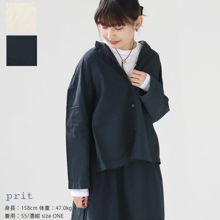 PRIT(プリット)のスタンドカラーシャツジャケット。薄手で表面に凹凸のあるオーガニックコットンサッカー生地を使用。柔らかな肌触りながら、さらっとドライな質感が特徴です。ゆとりのあるシルエットに、コンパクトな着丈がメリハリのあるバランスの良いシルエットに。シャツとしてはもちろん、羽織としても使える、着回し力の高いアイテムです。着用モデル:身長158cm/体重47kg