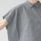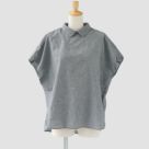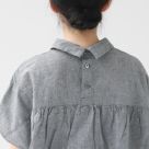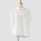小さめの衿と背中のボタン、ギャザーのディテールが、大人の可愛らしさを引き立てる一枚です。ゆったりとしたシルエットで、体型を選ばず着やすく、トップスインでもアウトでもバランス良く決まります。カラー「01.シロ」はやや透け感があり、インナーとのコーディネートも楽しめます。