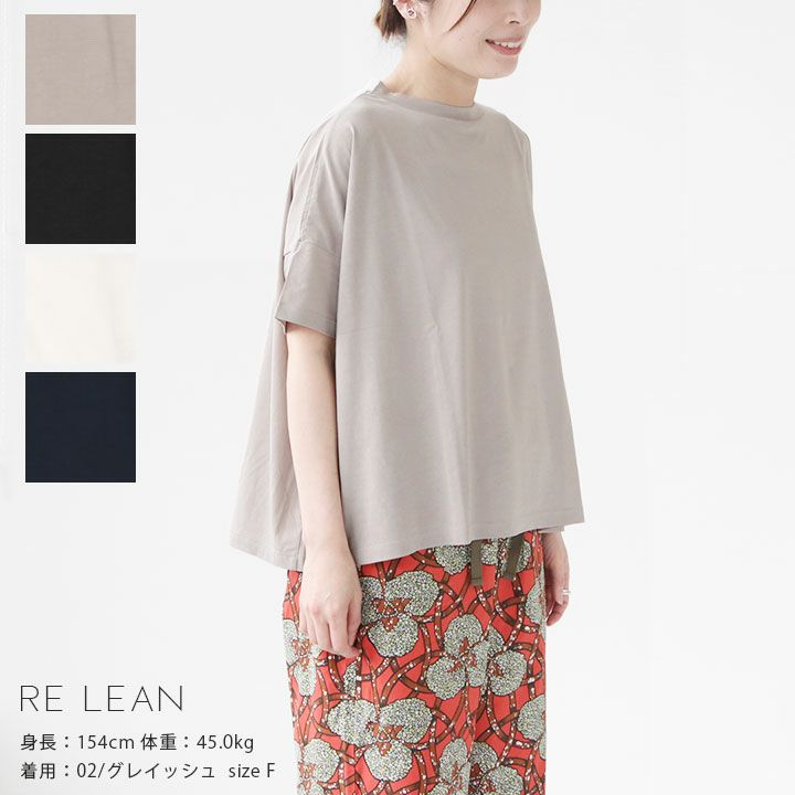 RE LEAN(レ リーン)のワイドTシャツ。サラサラとした生地感がとても肌触りの良い、サイロプレミアムを使用。抜群の軽さと伸縮性でストレスフリーな着心地です。身幅はたっぷりとワイドに取り、リラックス感のあるシルエットを表現。肩から袖にかけて切り替えラインのないデザインは、肩の丸みが女性らしく、気になる肩や二の腕をすっきりと見せてくれる効果も。程よくつまったネックラインでカジュアルになりすぎず、バランスの取れた大人シルエットに仕上がっています。シンプルなデザインで一枚着はもちろん、重ね着してもごろつきがないのでインナーとしても重宝する一枚です。着用モデル:身長154cm/体重45kg