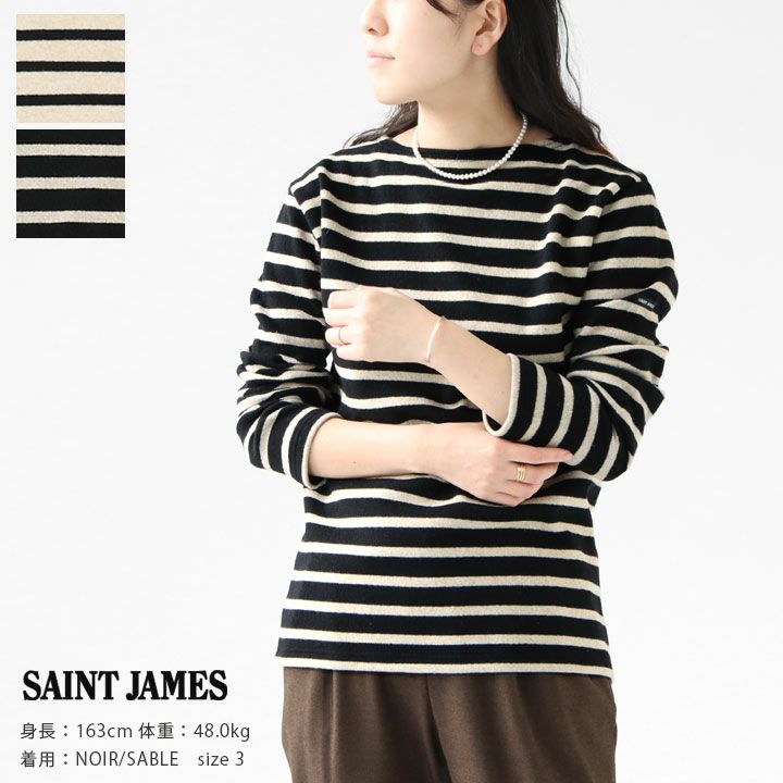 SAINT JAMES(セントジェームス)の圧縮ウールボーダーセーター。定番のウエッソンと同モデルで、型くずれしにくい混紡の圧縮ウール素材を使用し、とても軽くて快適な着心地です。直接肌に触れる裏側部分はスムースコットン素材なので、肌触りもよく、吸湿・保温性に優れています。セーターなのに軽くかさばらず、アウター必須の季節にも着こなしやすいのも高ポイントです。