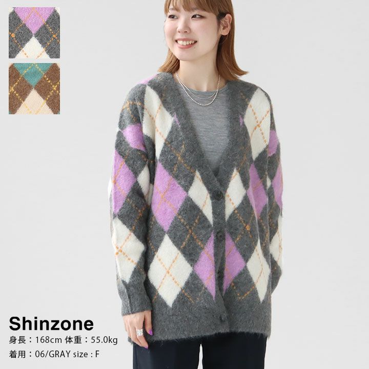 Shinzone(シンゾーン)のシャギーアーガイルカーディガン。暖かなウール素材を使用。毛足の長いふんわりとしたニットで柔らかな生地感です。冬に欲しくなるシャギーなニット。見たの暖かさはもちろん冬にしか着れないスペシャルな雰囲気を存分に楽しめるアイテム。配色から柄のサイズにまでこだわられたアーガイル。アクセントになった配色ステッチは全て手差しして頂いているという贅沢ものです。インナーには古着のTシャツを合わせてデニムパンツやおじパンでボーイッシュなスタイリングや、BIG SHIRTに足元はタイツとバレエシューズでガーリーなスタイリングも◎アウターからチラ見せさせても可愛く、この冬主役になるアイテムです。着用モデル:身長168cm/体重55kg