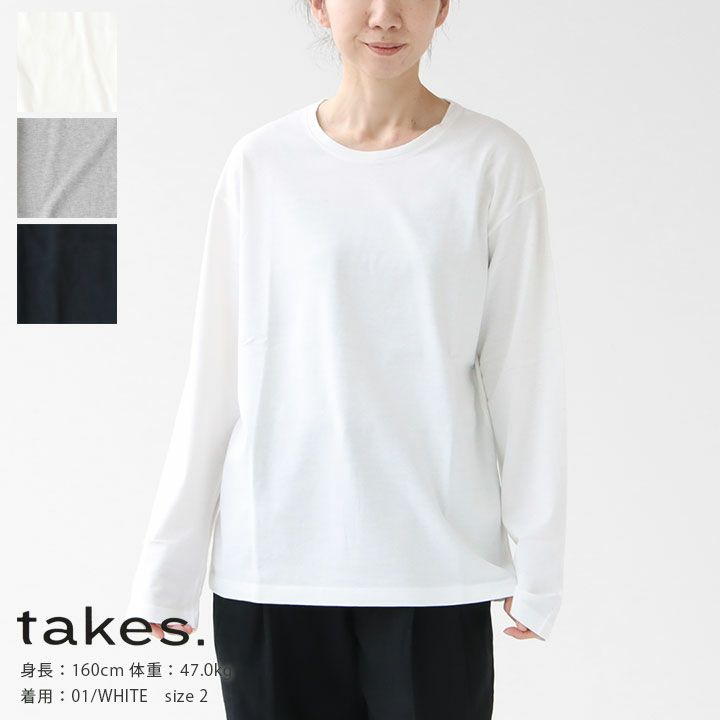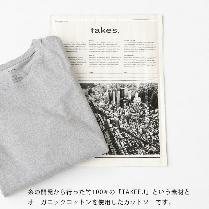 「竹を使った素材で人々を健康に」という思いで、吸水性・吸湿性・保温性に優れている竹繊維のTAKEFU(竹布)を用いたファションアイテムを提案している"takes.(テイクス)"。アイテムは糸まで全て天然繊維にこだわり、同繊維とオーガニックコットンを独自で紡績し、オリジナル生地を開発。柔らかい着心地と、サステナビリティに配慮していることも魅力です。"takes.(テイクス)"はセレクトショップのシンゾーン(Shinzone)の創業者である染谷裕之氏が代表を務め、クリエイティブ・ディレクションはウィメンズブランド「メヤメ(MEYAME)」を手掛ける染谷裕亮と染谷めぐみが担当しています。