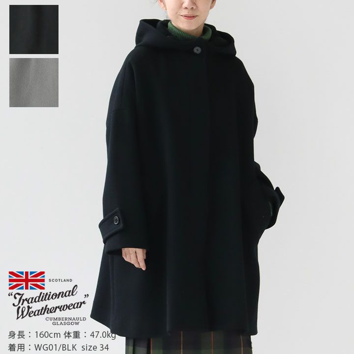 Traditional Weatherwear(トラディショナル・ウェザーウェア)のマールトン(MALTON)フードコート。ドロップショルダーにゆったりとした優しいシルエット、ダブルフェイスのメルトン素材のハリのある生地から生まれる美しいフードのフォルムが魅力。長く愛用いただけるシンプルなフェイスで、エレガントからカジュアルまであらゆるスタイルにフィットします。着用モデル:身長160cm/体重47kg