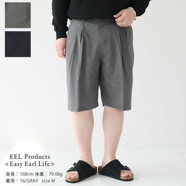 EEL Products(イール プロダクツ)の少年ショーツ。ブランド定番の”少年パンツ”のショートパンツモデル。ドライタッチでシャリ感のあるポリエステル素材を使用。シワになりにくく、速乾性に優れた生地感で、暑い夏でも快適な穿き心地です。フロントは2タックで、スラックスの様な綺麗目な要素もありつつ、ワタリと裾幅にゆとりを持たせ、程よく膨らみのあるシルエットの一本。ウエストの後ろはゴム仕様になっており、ラフな着心地も嬉しいポイント。スポーツショーツの涼しさと手入れのし易さがありながら、ドレスライクな印象もあるスラックスショーツ。一本あればカジュアルからキレイめまで幅広く使える万能パンツです。着用モデル:身長168cm/体重70kg(Mサイズ着用)