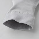 シルバーグレーのショートソックスをシンプルに配置したイメージ。なめらかな質感と上品で落ち着いた色合いが足元に自然になじむ印象の一足。 足裏のロゴをクローズアップしたショートソックス。シルクのようななめらかな質感が伝わる上質なディテール。 履き口部分をクローズアップしたショートソックス。やわらかく伸びのよい編み地で、締めつけ感の少ない快適なフィット感が伝わるディテール。