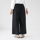 10/クロ着用の正面画像。prit イージーパンツ レディース オーガニックコットン ワイドシルエット ナチュラル 10/クロ着用の横向き画像。prit イージーパンツ 体のラインを拾わないワイドシルエット ナチュラル 10/クロ着用の後ろ向き画像。prit イージーパンツ ヒップラインを拾わないゆったりシルエット ナチュラル ヒップポケットの着用アップ画像