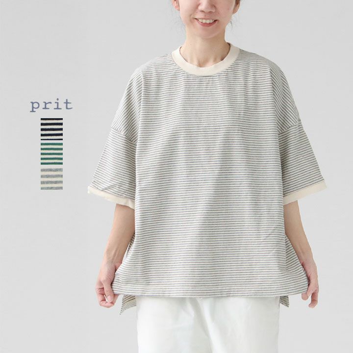 細ボーダーで上品に魅せる、PRITの5分袖プルオーバー