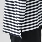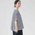 PRIT(プリット)の定番アイテム「リサイクルムラ糸天竺ボーダー5分袖ワイドTシャツ」は、柔らかな30番単糸コットンを使用した、着心地抜群の日本製Tシャツ。ナチュラルなボーダー柄とリラックス感のあるワイドシルエットが魅力で、デイリー使いにぴったりです。