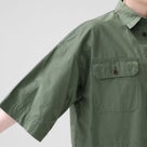 高密度コットンホースクロスを使用したクロップド丈ミリタリーシャツ。軽やかで柔らかく、ストーンバイオ加工によるヴィンテージ感が魅力。ハーフスリーブと立体的なバックプリーツで、一枚着も羽織りもバランス良く決まる一着。