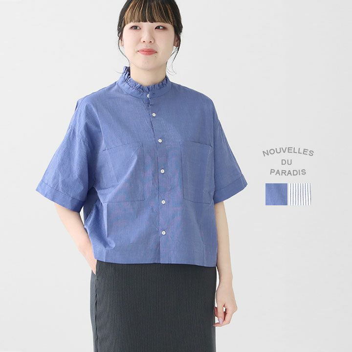 襟元のフリルが可愛い雰囲気を演出し顔周りを華やかに。一方で、存在感のある大きめの胸ポケットがカジュアルなアクセントになり、甘すぎない絶妙なバランスに仕上がっています。