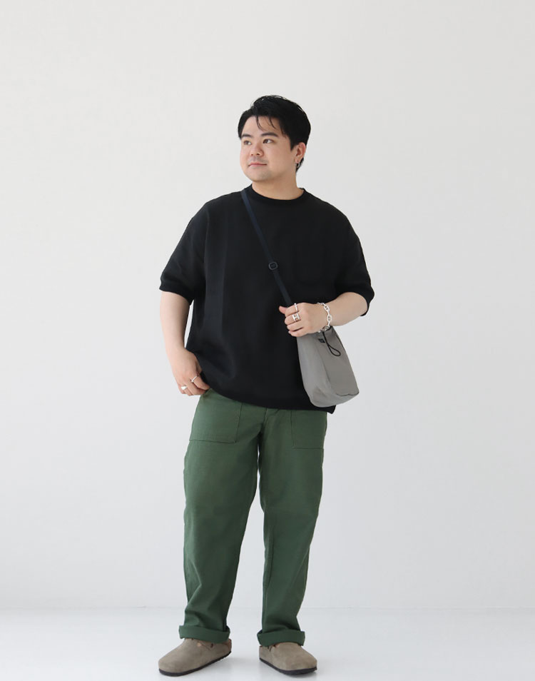 ブラック×カーキの武骨で、男らしいカジュアルコーデ。 全体のバランスをグッと引き締めてくれるので、スッキリとした印象に。 ダークな配色なので、グレーのバッグに、サンダルを合わせ、色味をプラスして軽さを出しました。