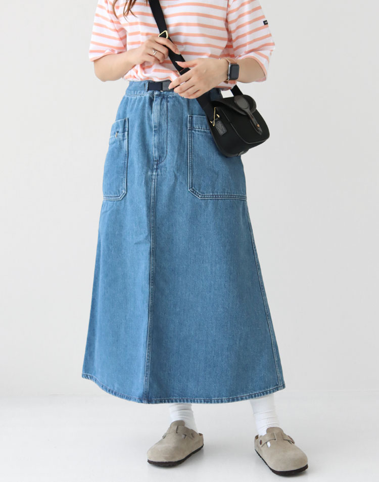 ボーダー×デニムはカジュアルな雰囲気になりがちだけど、パンツではなく”スカート”だから、少し大人っぽく着こなせるのがポイント♪ピンク色のボーダーは夏のスタイリングを華やかにしてくれますよ!