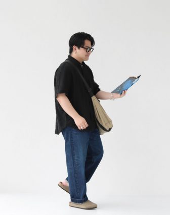 シックで表情のあるシャツに、武骨さとエレガンスさを両立させたデニムを合わせたシンプルコーデ。 ベージュカラーを差して抜け感を演出。軽さのあるスタイリングが多い夏ですが、たまには重たい印象のコーデも気分が変わるのでオススメです◎