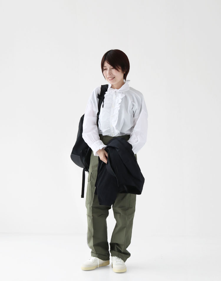 リュックの堂々たる存在感が、甘辛ミックスの引き締め役としてこなれたコーディネートに。どカジュアルにならないように、ブラウスにはフェミニンなデザインなものを。足元はチョークカラーのリーボックをチョイスしました。